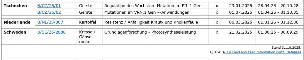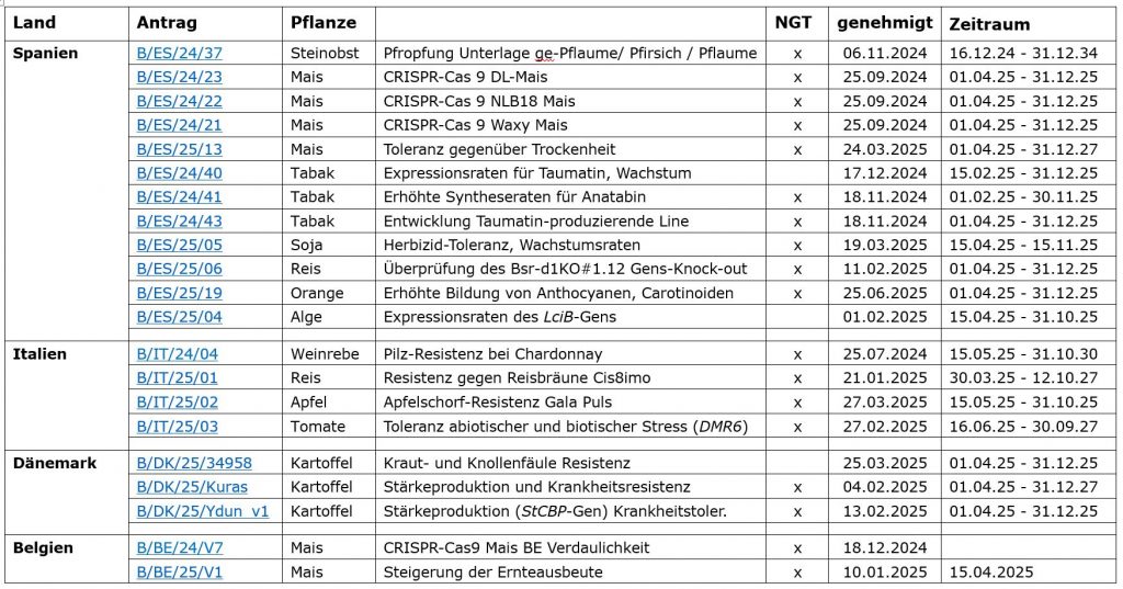 Die Anträge zu Freilandversuchen in Ländern der EU im Zeitraum Oktober 2024 – Oktober 2025 sind in nachfolgender Tabelle zusammengefasst. Die Tabelle zeigt nur die Anträge auf. Inwieweit die Versuche auch durchgeführt wurden oder auch durchgeführt werden, ist unklar, da deren Durchführung in der Regel nicht öffentlich bekannt gegeben werden. Hiermit sollen Feldzerstörungen vermieden werden.