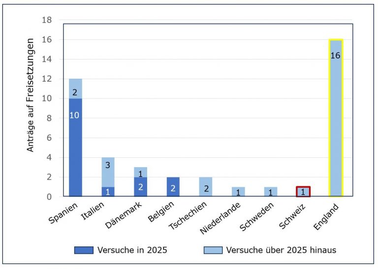 Für das Freisetzen zu Forschungszwecken benötigen gv-Pflanzen (einschließlich ge-Pflanzen) ebenfalls eine Genehmigung der kompetenten Behörde des EU-Mitgliedstaates in dem die wissenschaftliche Untersuchung stattfinden soll. In der EU müssen die Freisetzungen der Kommission für das ► zentrale Register mitgeteilt werden. Für den Zeitraum Oktober 2024 – Oktober 2025 haben sieben Mitgliedsstaaten insgesamt 22 Anträge zur Freisetzung von ge-Pflanzen und drei von gv-Pflanzen gemeldet. Mit Blick zu den Vorjahren erfolgen Freisetzung zu Forschungszwecken weiterhin kontinuierlich in EU-Raum, aber sie verharren hinsichtlich der europäischen Forschungskapazitäten auf niedrigem Niveau. Auf Grund der Möglichkeiten der neuen genomischen Techniken (NGT) stehen ge-Pflanzen im Vordergrund der wissenschaftlichen Untersuchungen im Freiland. Wie auch in den Vorjahren steht Spanien mit 12 Anträgen an der Spitze der EU-Länder, die Freisetzungsanträge gestellt haben. Italien hat 4 Anträge mitgeteilt, Dänemark 3, Belgien und Tschechien jeweils 2 und die Niederlande und Schweden jeweils 1 Antrag. Aus Deutschland ist kein Antrag auf eine Freisetzung zu verzeichnen, nicht einmal einer der im geschützten Areal der Agroscope in der Schweiz durchgeführt werden soll.
