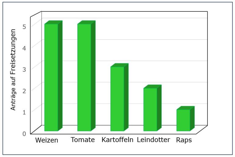 Pflanzen, die in der EU und der Schweiz freigesetzt werden sollen. Es handelt sich hier um Anträge, ob die Freisetzungen tatsächlich stattfinden ist unklar.