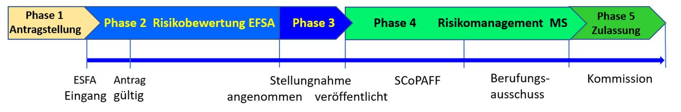 Das Zulassungsverfahren von gentechnisch veränderten Pflanzen (gv-Pflanzen) und daraus hergestellter Erzeugnisse verläuft in vier (fünf) Phasen ab: